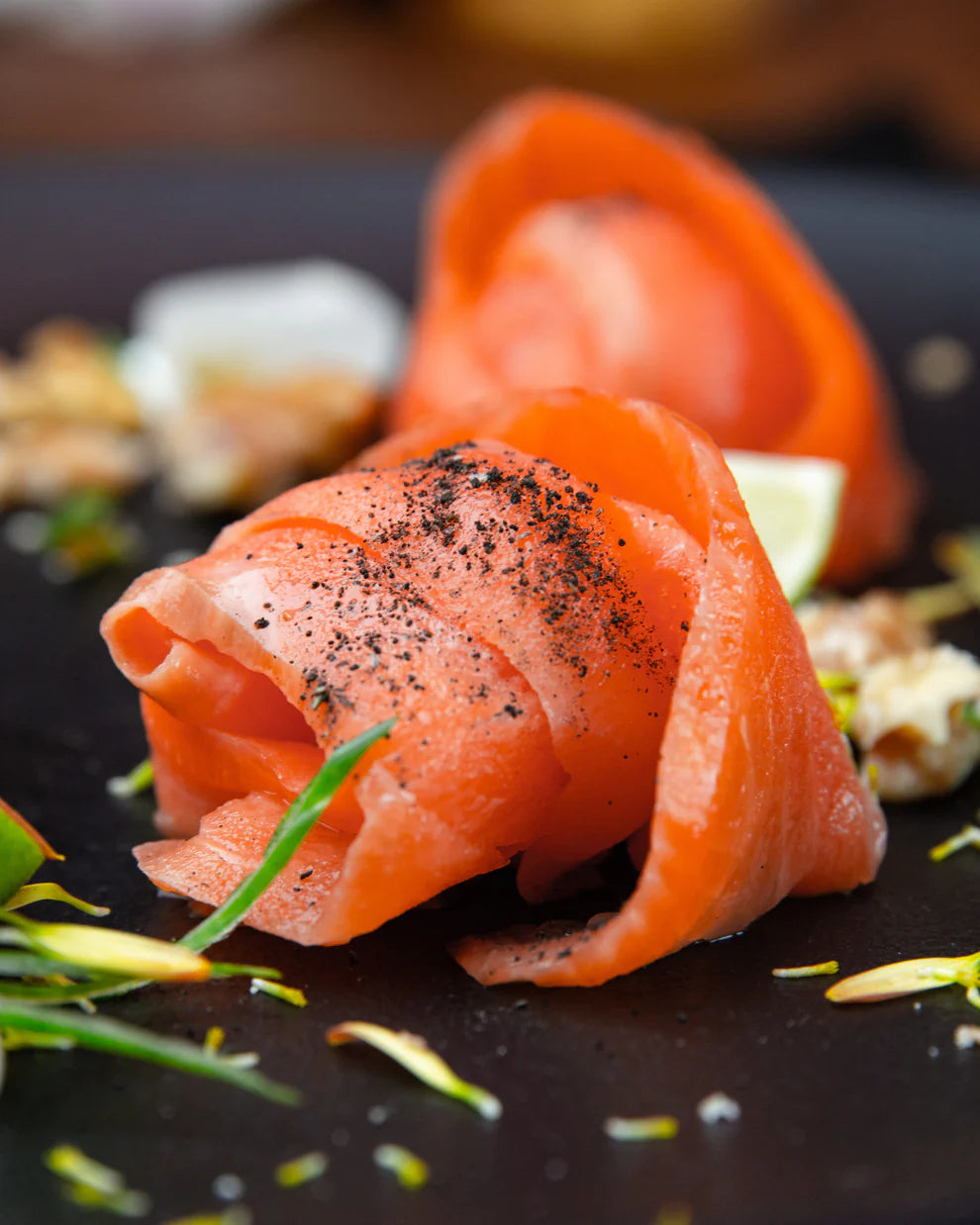 Suaves láminas de salmón ahumado a temperatura controlada por largo tiempo. Todos nuestros productos se venden congelados y sellados al vacío.